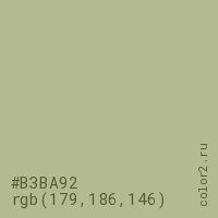 Цвет #B3BA92 в цветовой модели RGB обозначается тремя октетами (179, 186, 146) в десятичном формате и #B3BA92 в шестнадцатиричном (hex) формате, которые являются интенсивностью красного 179 (hex B3), интенсивность зелёного 186 (hex BA) и интенсивность синего 146 (hex 92).