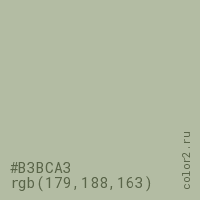 Цвет #B3BCA3 в цветовой модели RGB обозначается тремя октетами (179, 188, 163) в десятичном формате и #B3BCA3 в шестнадцатиричном (hex) формате, которые являются интенсивностью красного 179 (hex B3), интенсивность зелёного 188 (hex BC) и интенсивность синего 163 (hex A3).