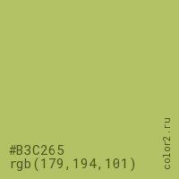 Цвет #B3C265 в цветовой модели RGB обозначается тремя октетами (179, 194, 101) в десятичном формате и #B3C265 в шестнадцатиричном (hex) формате, которые являются интенсивностью красного 179 (hex B3), интенсивность зелёного 194 (hex C2) и интенсивность синего 101 (hex 65).