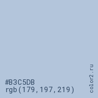 Цвет #B3C5DB в цветовой модели RGB обозначается тремя октетами (179, 197, 219) в десятичном формате и #B3C5DB в шестнадцатиричном (hex) формате, которые являются интенсивностью красного 179 (hex B3), интенсивность зелёного 197 (hex C5) и интенсивность синего 219 (hex DB).