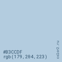 Цвет #B3CCDF в цветовой модели RGB обозначается тремя октетами (179, 204, 223) в десятичном формате и #B3CCDF в шестнадцатиричном (hex) формате, которые являются интенсивностью красного 179 (hex B3), интенсивность зелёного 204 (hex CC) и интенсивность синего 223 (hex DF).