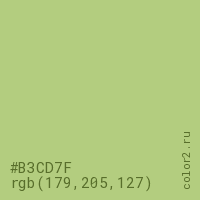 Цвет #B3CD7F в цветовой модели RGB обозначается тремя октетами (179, 205, 127) в десятичном формате и #B3CD7F в шестнадцатиричном (hex) формате, которые являются интенсивностью красного 179 (hex B3), интенсивность зелёного 205 (hex CD) и интенсивность синего 127 (hex 7F).