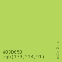 Цвет #B3D65B в цветовой модели RGB обозначается тремя октетами (179, 214, 91) в десятичном формате и #B3D65B в шестнадцатиричном (hex) формате, которые являются интенсивностью красного 179 (hex B3), интенсивность зелёного 214 (hex D6) и интенсивность синего 91 (hex 5B).