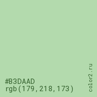 Цвет #B3DAAD в цветовой модели RGB обозначается тремя октетами (179, 218, 173) в десятичном формате и #B3DAAD в шестнадцатиричном (hex) формате, которые являются интенсивностью красного 179 (hex B3), интенсивность зелёного 218 (hex DA) и интенсивность синего 173 (hex AD).