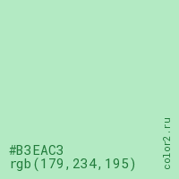 Цвет #B3EAC3 в цветовой модели RGB обозначается тремя октетами (179, 234, 195) в десятичном формате и #B3EAC3 в шестнадцатиричном (hex) формате, которые являются интенсивностью красного 179 (hex B3), интенсивность зелёного 234 (hex EA) и интенсивность синего 195 (hex C3).