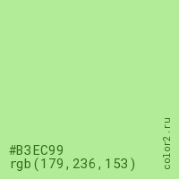 Цвет RGB(179, 236, 153) в процентом отношении количества цвета состоит из 70.2% красного (red), 92.5% зелёного (green) и 60% синего (blue).