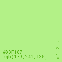 Цвет #B3F187 в цветовой модели RGB обозначается тремя октетами (179, 241, 135) в десятичном формате и #B3F187 в шестнадцатиричном (hex) формате, которые являются интенсивностью красного 179 (hex B3), интенсивность зелёного 241 (hex F1) и интенсивность синего 135 (hex 87).