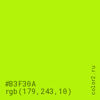 Цвет #B3F30A в цветовой модели RGB обозначается тремя октетами (179, 243, 10) в десятичном формате и #B3F30A в шестнадцатиричном (hex) формате, которые являются интенсивностью красного 179 (hex B3), интенсивность зелёного 243 (hex F3) и интенсивность синего 10 (hex 0A).