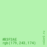Цвет RGB(179, 243, 174) в процентом отношении количества цвета состоит из 70.2% красного (red), 95.3% зелёного (green) и 68.2% синего (blue).