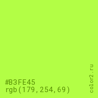 Цвет #B3FE45 в цветовой модели RGB обозначается тремя октетами (179, 254, 69) в десятичном формате и #B3FE45 в шестнадцатиричном (hex) формате, которые являются интенсивностью красного 179 (hex B3), интенсивность зелёного 254 (hex FE) и интенсивность синего 69 (hex 45).