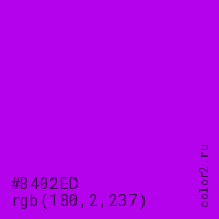 Цвет #B402ED в цветовой модели RGB обозначается тремя октетами (180, 2, 237) в десятичном формате и #B402ED в шестнадцатиричном (hex) формате, которые являются интенсивностью красного 180 (hex B4), интенсивность зелёного 2 (hex 02) и интенсивность синего 237 (hex ED).