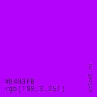 Цвет #B403FB в цветовой модели RGB обозначается тремя октетами (180, 3, 251) в десятичном формате и #B403FB в шестнадцатиричном (hex) формате, которые являются интенсивностью красного 180 (hex B4), интенсивность зелёного 3 (hex 03) и интенсивность синего 251 (hex FB).