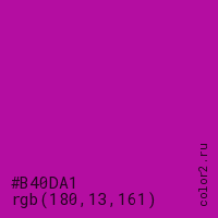 Цвет #B40DA1 в цветовой модели RGB обозначается тремя октетами (180, 13, 161) в десятичном формате и #B40DA1 в шестнадцатиричном (hex) формате, которые являются интенсивностью красного 180 (hex B4), интенсивность зелёного 13 (hex 0D) и интенсивность синего 161 (hex A1).