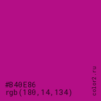 Цвет #B40E86 в цветовой модели RGB обозначается тремя октетами (180, 14, 134) в десятичном формате и #B40E86 в шестнадцатиричном (hex) формате, которые являются интенсивностью красного 180 (hex B4), интенсивность зелёного 14 (hex 0E) и интенсивность синего 134 (hex 86).