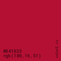 Цвет #B41033 в цветовой модели RGB обозначается тремя октетами (180, 16, 51) в десятичном формате и #B41033 в шестнадцатиричном (hex) формате, которые являются интенсивностью красного 180 (hex B4), интенсивность зелёного 16 (hex 10) и интенсивность синего 51 (hex 33).