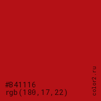 Цвет #B41116 в цветовой модели RGB обозначается тремя октетами (180, 17, 22) в десятичном формате и #B41116 в шестнадцатиричном (hex) формате, которые являются интенсивностью красного 180 (hex B4), интенсивность зелёного 17 (hex 11) и интенсивность синего 22 (hex 16).