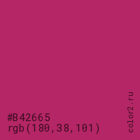Цвет #B42665 в цветовой модели RGB обозначается тремя октетами (180, 38, 101) в десятичном формате и #B42665 в шестнадцатиричном (hex) формате, которые являются интенсивностью красного 180 (hex B4), интенсивность зелёного 38 (hex 26) и интенсивность синего 101 (hex 65).