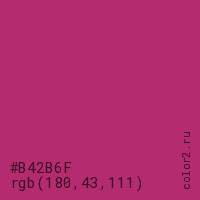 Цвет #B42B6F в цветовой модели RGB обозначается тремя октетами (180, 43, 111) в десятичном формате и #B42B6F в шестнадцатиричном (hex) формате, которые являются интенсивностью красного 180 (hex B4), интенсивность зелёного 43 (hex 2B) и интенсивность синего 111 (hex 6F).