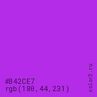 Цвет #B42CE7 в цветовой модели RGB обозначается тремя октетами (180, 44, 231) в десятичном формате и #B42CE7 в шестнадцатиричном (hex) формате, которые являются интенсивностью красного 180 (hex B4), интенсивность зелёного 44 (hex 2C) и интенсивность синего 231 (hex E7).