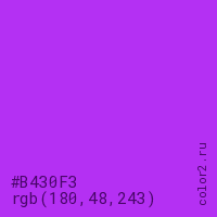 Цвет #B430F3 в цветовой модели RGB обозначается тремя октетами (180, 48, 243) в десятичном формате и #B430F3 в шестнадцатиричном (hex) формате, которые являются интенсивностью красного 180 (hex B4), интенсивность зелёного 48 (hex 30) и интенсивность синего 243 (hex F3).