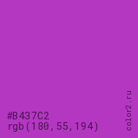 Цвет #B437C2 в цветовой модели RGB обозначается тремя октетами (180, 55, 194) в десятичном формате и #B437C2 в шестнадцатиричном (hex) формате, которые являются интенсивностью красного 180 (hex B4), интенсивность зелёного 55 (hex 37) и интенсивность синего 194 (hex C2).