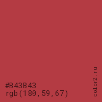 Цвет #B43B43 в цветовой модели RGB обозначается тремя октетами (180, 59, 67) в десятичном формате и #B43B43 в шестнадцатиричном (hex) формате, которые являются интенсивностью красного 180 (hex B4), интенсивность зелёного 59 (hex 3B) и интенсивность синего 67 (hex 43).
