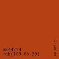 Цвет #B44214 в цветовой модели RGB обозначается тремя октетами (180, 66, 20) в десятичном формате и #B44214 в шестнадцатиричном (hex) формате, которые являются интенсивностью красного 180 (hex B4), интенсивность зелёного 66 (hex 42) и интенсивность синего 20 (hex 14).
