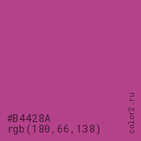 Цвет #B4428A в цветовой модели RGB обозначается тремя октетами (180, 66, 138) в десятичном формате и #B4428A в шестнадцатиричном (hex) формате, которые являются интенсивностью красного 180 (hex B4), интенсивность зелёного 66 (hex 42) и интенсивность синего 138 (hex 8A).