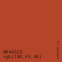 Цвет #B44528 в цветовой модели RGB обозначается тремя октетами (180, 69, 40) в десятичном формате и #B44528 в шестнадцатиричном (hex) формате, которые являются интенсивностью красного 180 (hex B4), интенсивность зелёного 69 (hex 45) и интенсивность синего 40 (hex 28).