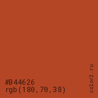 Цвет #B44626 в цветовой модели RGB обозначается тремя октетами (180, 70, 38) в десятичном формате и #B44626 в шестнадцатиричном (hex) формате, которые являются интенсивностью красного 180 (hex B4), интенсивность зелёного 70 (hex 46) и интенсивность синего 38 (hex 26).