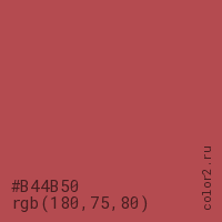 Цвет #B44B50 в цветовой модели RGB обозначается тремя октетами (180, 75, 80) в десятичном формате и #B44B50 в шестнадцатиричном (hex) формате, которые являются интенсивностью красного 180 (hex B4), интенсивность зелёного 75 (hex 4B) и интенсивность синего 80 (hex 50).
