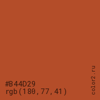 Цвет #B44D29 в цветовой модели RGB обозначается тремя октетами (180, 77, 41) в десятичном формате и #B44D29 в шестнадцатиричном (hex) формате, которые являются интенсивностью красного 180 (hex B4), интенсивность зелёного 77 (hex 4D) и интенсивность синего 41 (hex 29).