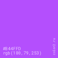 Цвет #B44FFD в цветовой модели RGB обозначается тремя октетами (180, 79, 253) в десятичном формате и #B44FFD в шестнадцатиричном (hex) формате, которые являются интенсивностью красного 180 (hex B4), интенсивность зелёного 79 (hex 4F) и интенсивность синего 253 (hex FD).