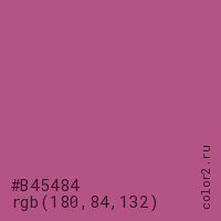 Цвет #B45484 в цветовой модели RGB обозначается тремя октетами (180, 84, 132) в десятичном формате и #B45484 в шестнадцатиричном (hex) формате, которые являются интенсивностью красного 180 (hex B4), интенсивность зелёного 84 (hex 54) и интенсивность синего 132 (hex 84).