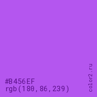 Цвет #B456EF в цветовой модели RGB обозначается тремя октетами (180, 86, 239) в десятичном формате и #B456EF в шестнадцатиричном (hex) формате, которые являются интенсивностью красного 180 (hex B4), интенсивность зелёного 86 (hex 56) и интенсивность синего 239 (hex EF).