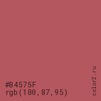 Цвет #B4575F в цветовой модели RGB обозначается тремя октетами (180, 87, 95) в десятичном формате и #B4575F в шестнадцатиричном (hex) формате, которые являются интенсивностью красного 180 (hex B4), интенсивность зелёного 87 (hex 57) и интенсивность синего 95 (hex 5F).