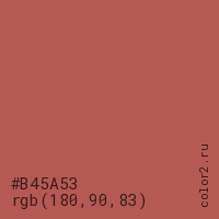 Цвет #B45A53 в цветовой модели RGB обозначается тремя октетами (180, 90, 83) в десятичном формате и #B45A53 в шестнадцатиричном (hex) формате, которые являются интенсивностью красного 180 (hex B4), интенсивность зелёного 90 (hex 5A) и интенсивность синего 83 (hex 53).