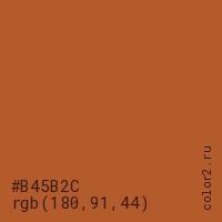 Цвет #B45B2C в цветовой модели RGB обозначается тремя октетами (180, 91, 44) в десятичном формате и #B45B2C в шестнадцатиричном (hex) формате, которые являются интенсивностью красного 180 (hex B4), интенсивность зелёного 91 (hex 5B) и интенсивность синего 44 (hex 2C).