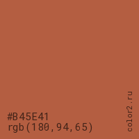 Цвет #B45E41 в цветовой модели RGB обозначается тремя октетами (180, 94, 65) в десятичном формате и #B45E41 в шестнадцатиричном (hex) формате, которые являются интенсивностью красного 180 (hex B4), интенсивность зелёного 94 (hex 5E) и интенсивность синего 65 (hex 41).