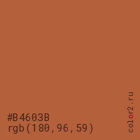 Цвет #B4603B в цветовой модели RGB обозначается тремя октетами (180, 96, 59) в десятичном формате и #B4603B в шестнадцатиричном (hex) формате, которые являются интенсивностью красного 180 (hex B4), интенсивность зелёного 96 (hex 60) и интенсивность синего 59 (hex 3B).