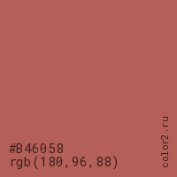 Цвет #B46058 в цветовой модели RGB обозначается тремя октетами (180, 96, 88) в десятичном формате и #B46058 в шестнадцатиричном (hex) формате, которые являются интенсивностью красного 180 (hex B4), интенсивность зелёного 96 (hex 60) и интенсивность синего 88 (hex 58).