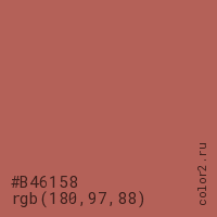 Цвет #B46158 в цветовой модели RGB обозначается тремя октетами (180, 97, 88) в десятичном формате и #B46158 в шестнадцатиричном (hex) формате, которые являются интенсивностью красного 180 (hex B4), интенсивность зелёного 97 (hex 61) и интенсивность синего 88 (hex 58).