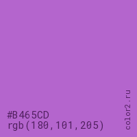 Цвет #B465CD в цветовой модели RGB обозначается тремя октетами (180, 101, 205) в десятичном формате и #B465CD в шестнадцатиричном (hex) формате, которые являются интенсивностью красного 180 (hex B4), интенсивность зелёного 101 (hex 65) и интенсивность синего 205 (hex CD).