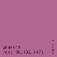 Цвет #B46693 в цветовой модели RGB обозначается тремя октетами (180, 102, 147) в десятичном формате и #B46693 в шестнадцатиричном (hex) формате, которые являются интенсивностью красного 180 (hex B4), интенсивность зелёного 102 (hex 66) и интенсивность синего 147 (hex 93).