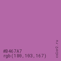 Цвет #B467A7 в цветовой модели RGB обозначается тремя октетами (180, 103, 167) в десятичном формате и #B467A7 в шестнадцатиричном (hex) формате, которые являются интенсивностью красного 180 (hex B4), интенсивность зелёного 103 (hex 67) и интенсивность синего 167 (hex A7).