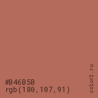 Цвет #B46B5B в цветовой модели RGB обозначается тремя октетами (180, 107, 91) в десятичном формате и #B46B5B в шестнадцатиричном (hex) формате, которые являются интенсивностью красного 180 (hex B4), интенсивность зелёного 107 (hex 6B) и интенсивность синего 91 (hex 5B).