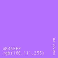 Цвет #B46FFF в цветовой модели RGB обозначается тремя октетами (180, 111, 255) в десятичном формате и #B46FFF в шестнадцатиричном (hex) формате, которые являются интенсивностью красного 180 (hex B4), интенсивность зелёного 111 (hex 6F) и интенсивность синего 255 (hex FF).