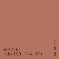 Цвет #B47261 в цветовой модели RGB обозначается тремя октетами (180, 114, 97) в десятичном формате и #B47261 в шестнадцатиричном (hex) формате, которые являются интенсивностью красного 180 (hex B4), интенсивность зелёного 114 (hex 72) и интенсивность синего 97 (hex 61).