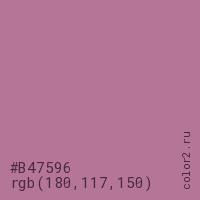 Цвет #B47596 в цветовой модели RGB обозначается тремя октетами (180, 117, 150) в десятичном формате и #B47596 в шестнадцатиричном (hex) формате, которые являются интенсивностью красного 180 (hex B4), интенсивность зелёного 117 (hex 75) и интенсивность синего 150 (hex 96).