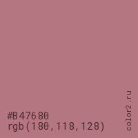 Цвет #B47680 в цветовой модели RGB обозначается тремя октетами (180, 118, 128) в десятичном формате и #B47680 в шестнадцатиричном (hex) формате, которые являются интенсивностью красного 180 (hex B4), интенсивность зелёного 118 (hex 76) и интенсивность синего 128 (hex 80).
